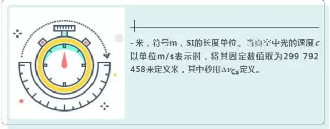 - 米,符號(hào)m,SI的長(zhǎng)度單位。當(dāng)真空中光的速度c以單位m/s表示時(shí),將其固定數(shù)值取為299 792 458來(lái)定義米,其中秒用DnCs定義。